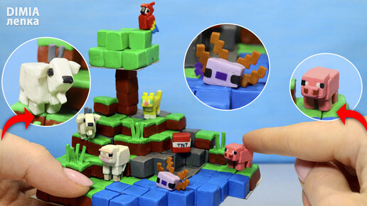 МАЙНКРАФТ ДИОРАМА (аксолотль, попугай, кот, овца, козел из пластилина)