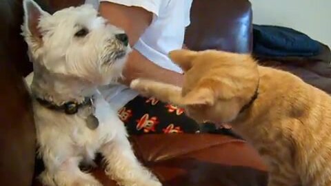 Ну чего ты дерешься, мы ведь оба пушистики 🐶😼 Очень добрый пёс пытается защититься от рыжего кота-забияки😹