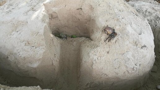 Раки-отшельники катаются с песочной горки на пляже в Тайланде