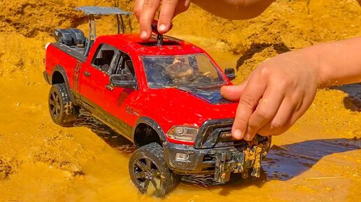Kids play with BRUDER cars in water in mud