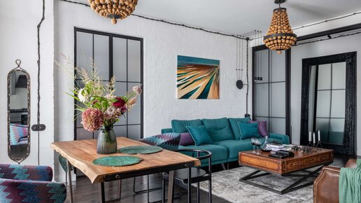 Гостиная в сталинке, в которой предусмотрели не только белый кирпич, открытую черную проводку, но и настоящую чугунную печь