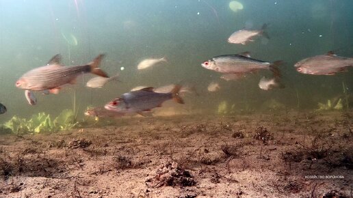 На озере Шейно прикормил плотву комбикормом. Подводные съёмки рыбы с глубины 1 метр