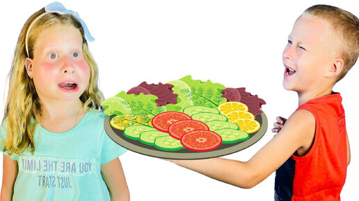 Никита и Полина играют и учат правильно питаться