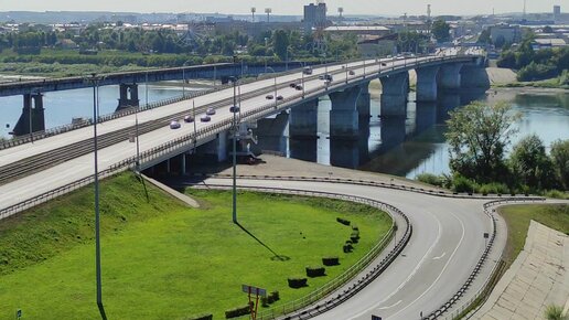 Вид на Кемерово со смотровой площадки у памятника шахтерам на "Красной горке": мосты, дома и трубы