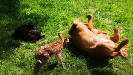 Дикая олениха навещает друга-пса вместе со своими детенышами