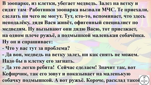 В зоопарке из клетки убегает медведь. Залез на ветку и сидит там. Работники не знаю что делать. Вызвали дядю Васю...Анекдот
