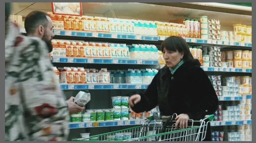 Парень подходит к покупателям в магазине, якобы ищет зарядку для молока