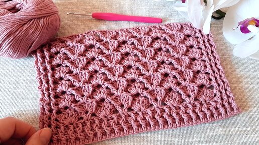 Вяжем рельефный узор из веерков крючком. Раппорт всего 2 ряда!