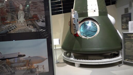 Ракетоноситель, костюм космонавта, и космический аппарат снаружи и внутри в Музее космонавтики в Москве