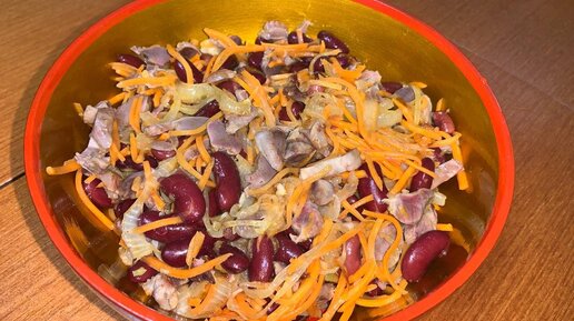 Сытный салат с куриными желудочками.