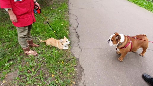 Бульдоги Варя и Алик знакомятся с щенком корги Фоссей