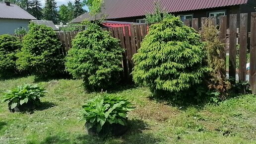 Я посадила хосты в автомобильные покрышки и подстригла ёлочки вдоль нашего забора на даче 01.06.2021