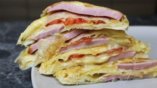 Всё сложил в сковороду и ленивый завтрак готов. Лепёшка из лаваша с начинкой