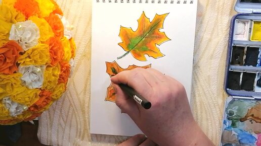 Яркие кленовые листья. Быстрый и простой скетч акварелью для детей и начинающих
