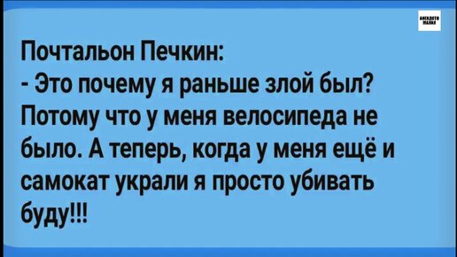 Почтальон Печкин: -Почему я раньше злой был?Потому что у меня велосипеда не было.А теперь, когда у меня самокат украли. Анекдот