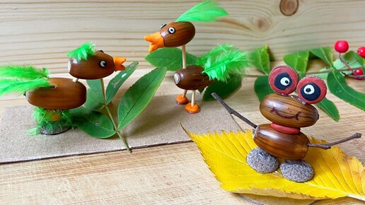 Веселая осенняя поделка из желудей. Дети в восторге от получившихся птичек и лягушки. МК