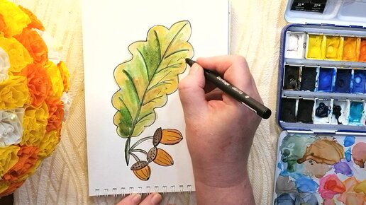 Дубовый лист и три жёлудя. Быстрый осенний скетч акварелью