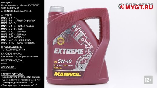 Моторное масло Mannol EXTREME 7915 SAE 5W-40 API SN/CH-4 ACEA A3/B4 4L #ANTON_MYGT