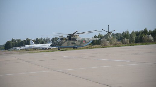 Взлёт вертолётов: Ми-8МТ, 2х Ми-28н с ПТБ, Ка-52 "Аллигатор", 2х Ми-8МТВ-5, в конце взлёт Ми-26 с водосливным устройством ВСУ-15