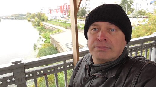 Человек в городе на мосту, трубы в реке. Ремонт моста. Красный мост, город Орёл