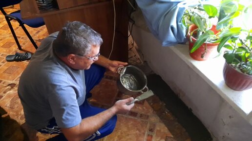Многие не верят , что мы так живём , но мы вынуждены . Отходит стена в доме , отец замазывает цементом.
