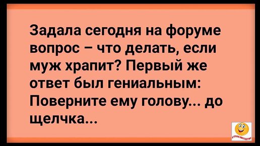Задала женщина вопрос на форуме, что делать, если муж храпит. Первый же ответ: - Поверните ему голову. До щелчка. Анекдот