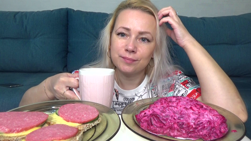Мукбанг селедка под шубой, кофе с бутербродами. Еда на камеру.