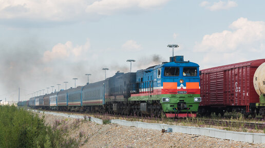 Тепловоз 2ТЭ10МД с американским двигателем General Electric ведет пассажирский поезд Нижний Бестях - Тында