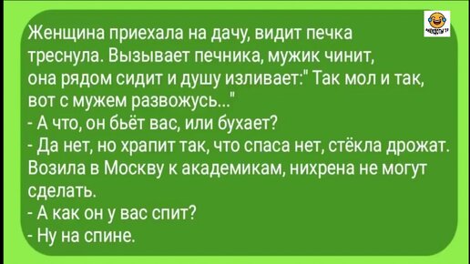 Женщина приехала на дачу, вызвала печника, да начала ему изливать душу. Мол с мужем разводится. Анекдот