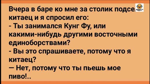 Мужик спрашивает китайца: - Ты занимался Кунг Фу? - Вы это спрашиваете потому что я китаец? Анекдот