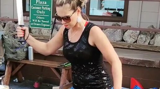 Девушка тестирует свой нож на брусе