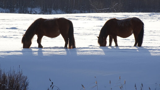 Якутские лошади добывают корм из под снега. Тебенуются.
