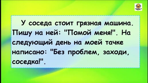 Женщина пишет на грязной машине соседа:"Помой меня". На утро на ее машине ответ:"Без проблем, заходи, соседка" Анекдот
