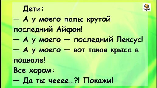 Дети хвастаются перед друг другом:-У моего папы последний айфон! -У моего Лексус! -У моего большая крыса! Хором: -Покажи Анекдот