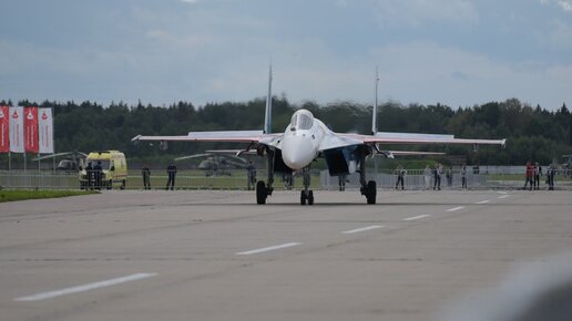 Посадка и руление пары Су-35с пилотажной группы "Русские Витязи". Аэродром Кубинка, форум "Армия 2021"