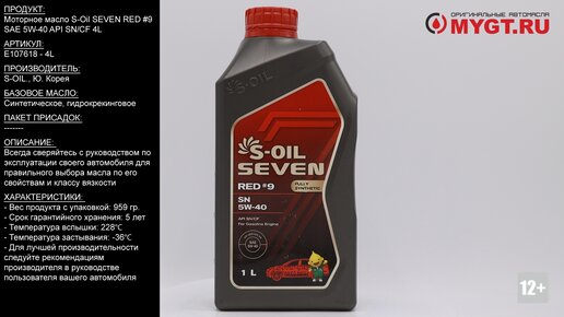 Моторное масло S-Oil SEVEN RED #9 SAE 5W-40 API SN/CF 4L ANTON_MYGT