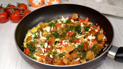 Яичница с помидорами , луком и хлебом, как пицца. Сытный вкусный завтрак