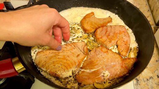 Рецепт филе тунца желтопёрого на сковороде с грибами в сливочном соусе.