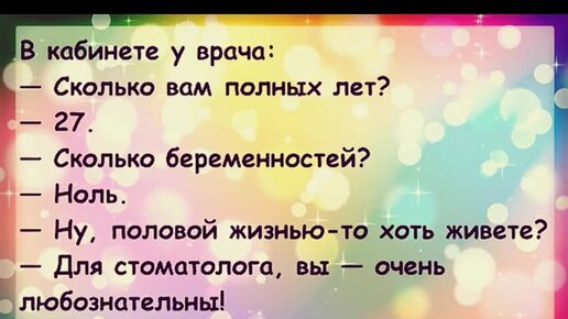 В кабинете у врача: - Сколько вам полных лет? - 27 - Сколько беременностей? - Ноль - Ну, половой жизнью-то......Анекдоты