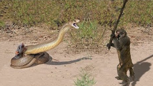 Кобра напала на обезьянку, но макака дала отпор. Взяла палку и начала биться как рыцарь с мечом, такое нужно увидеть!!