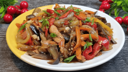 Куриное филе или индейка с овощами, в соевом соусе с чесноком и зеленью.