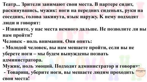Театр...Зрители занимают свои места. В партере сидит, раскинувшись, мужик: ноги на передних на передних сиденьях...Анекдоты!!