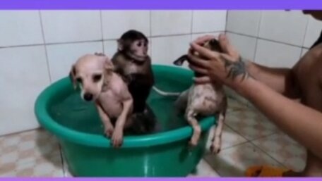 Обезьянка ждёт свою очередь, пока хозяин помоет своих собак, дальше можно будет посмотреть как моют обезьян))