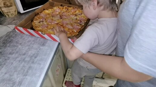 Хаски очень обрадовались пицце, а сын сказал бееее и вытер руки о рубашку.