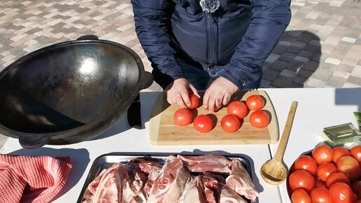 МЯСО ТОМЛЕНОЕ В ПОМИДОРАХ / Баранина в казане на костре томленая в томатах.
