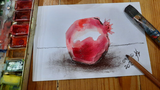Рисую акварелью и углём этюд с гранатом за 4 минуты