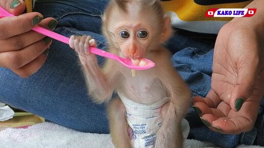 Мартышка ест ужин с ложки.