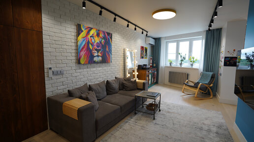 Как без дизайнера обустроили просторную гостиную со стеклянной лофт перегородкой и ярким декором