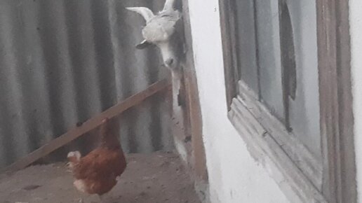 Реакция козы и козленка на непрошенную гостью