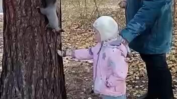 Маленькая белочка и маленькая девочка.